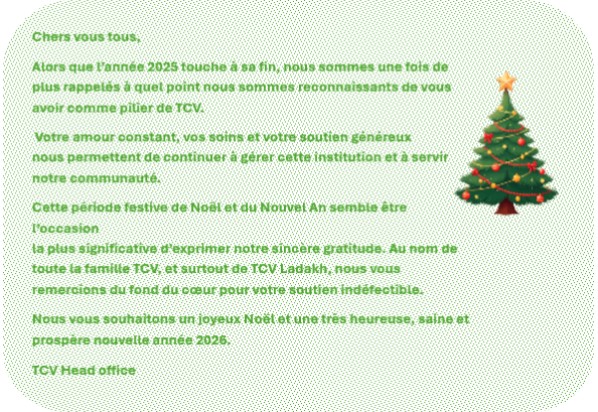 Chers tous, L’année 2025 touche à sa fin et il est temps de vous souhaiter une belle année 2026, remplie de joie, de lumière, de sérénité et de petits bonheurs. Merci pour votre confiance envers notre association et pour le soutien que vous apportez aux enfants d’Inde, du Ladakh et du Népal.